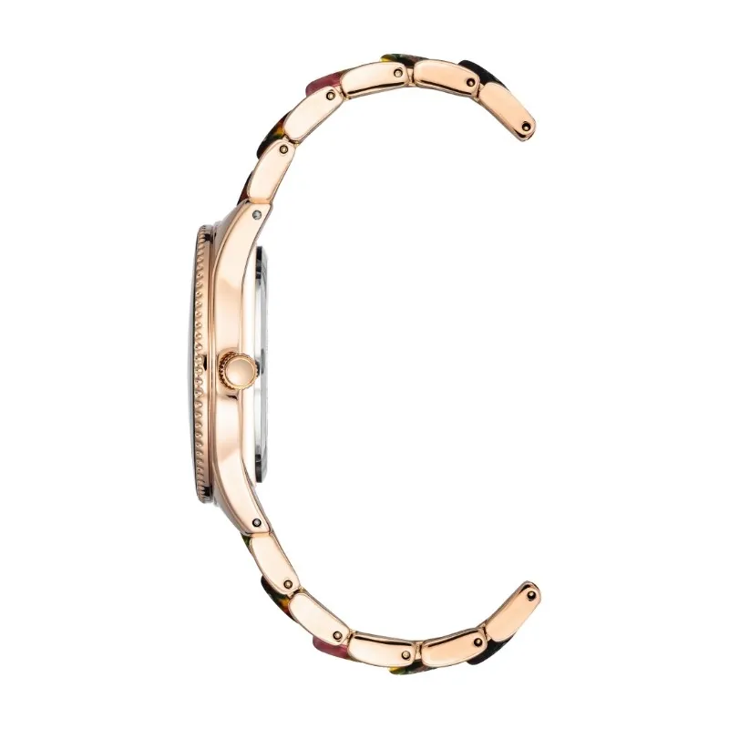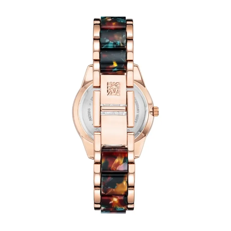 Anne Klein 37 mm AK-3214BNRG to wyrazisty zegarek, który przyciąga uwagę unikalnym designem. Koperta w kolorze różowego złota otacza tarczę o głębokim brązowym odcieniu, która harmonizuje z detalami w postaci wyrazistych indeksów. Bransoleta i bezel ozdobione wzorem inspirowanym wielobarwnym bursztynem dodają zegarkowi artystycznego charakteru. Idealny wybór dla kobiet ceniących odważne dodatki, które wyróżniają się w tłumie.