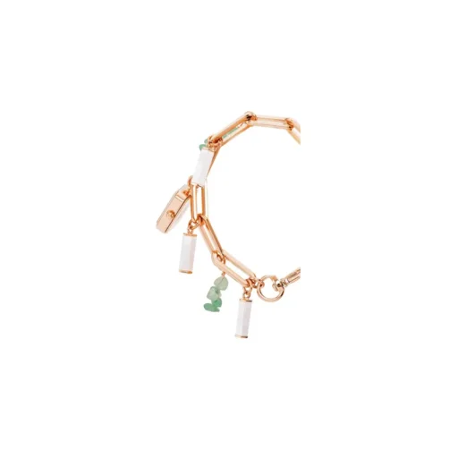 Anne Klein Classic 18mm AK-4108AVCH to wyjątkowy zegarek w formie bransoletki, który łączy w sobie funkcjonalność i biżuteryjny charakter. Różowozłota koperta w kształcie prostokąta otacza subtelną zieloną tarczę, która dodaje elegancji i świeżości. Bransoletka zdobiona uroczymi zawieszkami, w tym naturalnymi kamieniami i elementami inspirowanymi perłami, czyni ten zegarek idealnym wyborem dla kobiet ceniących oryginalny design i unikalny styl.