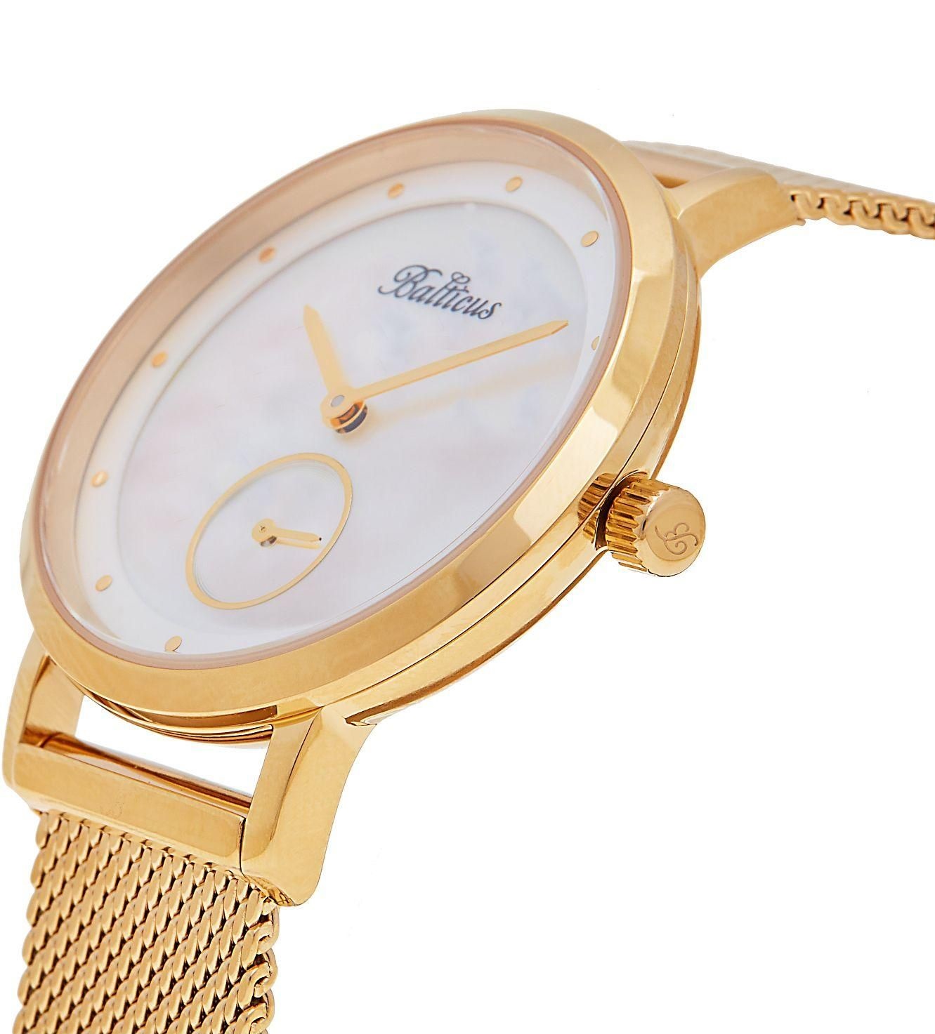 Balticus New Sky, gold, white pearl to modny subtelny damski zegarek o bardzo biżuteryjnym charakterze. Punktem centralnym zegarków z linii Sky zawsze była tarcza, nie inaczej jest w tym przypadku.